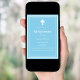 Un arrière - plan bleu ciel, décoré d'un cadre blanc, et d'une croix blanche Personnalisez et ajoutez le nom et les détails. Texte blanc.