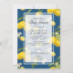 "Citrus floral citron vert bleu Baby Boy Shower Invitation design est une suite d'invitation lumineuse et colorée." Un lancer de citrons, de grappes de citrons aux fleurs d'agrumes et de feuillage feuillu sur arrière - plan bleu marine, a été peint par Audrey Jeanne Roberts, artiste et designer de renommée internationale. Copyright, tous droits réservés.