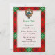 Clan Morrison badge crête entouré d'une courroie et boucle sur l'arrière - plan tartan rouge. Texte personnalisé des deux côtés.