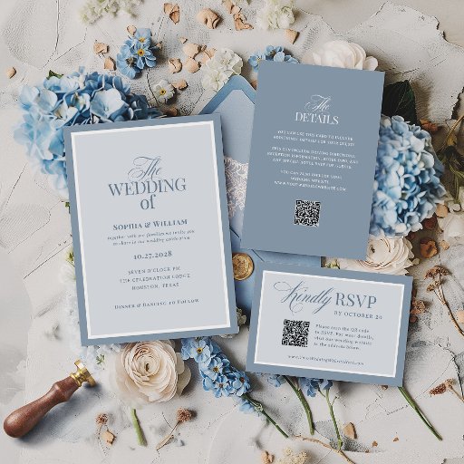 These elegant, luxe wedding invitations feature a dusty blue border and a lighter blue and white design. There is a mix of classic text and modern calligraphy for a classy and minimalist design perfect for your timeless, formal wedding.