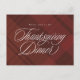 Cette carte d'invitation classique pour le dîner de Thanksgiving est le moyen idéal pour inviter des invités à un festin de fête. Présentant un carreau d'automne avec des couleurs profondes et riches comme le marron, l'orange et le prune, ce design comporte également une élégante écriture "Dîner de Thanksgiving" et un espace pour tous les détails de la fête au verso. Créée par Lea Delaveris Design, cette carte d'invitation de Thanksgiving fait partie d'une collection où vous pouvez trouver des étiquettes d'adresse coordonnées, des fournitures de fête, de la décoration de Thanksgiving et plus encore.