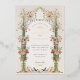 Cette faire-part de mariage est une toile romantique peinte dans les tons doux d'un jardin anglais. Les fleurs de carnation rose, corail et ivoire descendent en cascade les urnes dorées ornées, symbolisant la croissance et la floraison de l'amour. L'arcade fleurie, ornée d'une végétation délicate, encadre les initiales du couple dans un style victorien traditionnel, créant une entrée accueillante pour la célébration de l'unité. Ci-dessous, une scène pittoresque se déroule avec une famille d'oiseaux, faisant écho au thème de la convivialité. Ce design saisit l'essence de l'élégance intemporelle, parfaite pour le couple qui souhaite associer le charme classique d'une époque révolue à la joyeuse promesse de leur avenir ensemble.