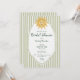This whimsical coastal bridal shower invitation features a vintage sun motif, lace border, palm trees, and stylish sage green stripe background. Perfect for a beach or California destination wedding theme event. Created by Simply Farmhouse Press.
