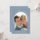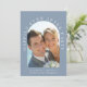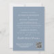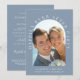 Faire part de mariage ou d'annonce de mariage intime ou de réception en bleu poussiéreux chic. Le devant présente votre photo dans un cadre en arc et "Happily Ever After Party" dans une typographie blanche élégante. Sous votre photo, ajoutez vos prénoms, date et lieu de mariage. Au verso, personnalisez votre invitation, ajoutez vos noms dans un script ressemblant à une signature et entrez l'adresse de votre site web de mariage pour créer un code QR scannable pour que vos invités puissent répondre en ligne et obtenir des détails supplémentaires.