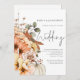 Mariage Code QR de Script de Citrouille Florale d'Automne. Ajoutez votre code QR sur votre site web de mariage au verso, cela en fait une option pratique pour que vos invités répondent et voient tous les détails sans avoir besoin de cartes de réponse et de détails séparées. Votre code QR sera généré automatiquement lorsque vous remplacerez l'URL exemple par le vôtre. Un ensemble de texte manuscrit pour le mariage et le reste du texte que vous pouvez facilement personnaliser. Des florales de couleur automnale et une citrouille descendent le long du côté gauche et traversent le bas et sont également au verso.