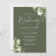 Cette élégante invitation de mariage aux feuilles de verdure botanique vert olive peut être personnalisée avec vos détails en typographie moderne avec les détails de votre site web de mariage et votre code QR au verso. Conçu par Thisisnotme