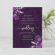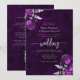 Cette invitation de mariage élégante présente des bouquets de fleurs de prune mis en valeur avec un feuillage en faux foil argenté dans deux coins, sur une image de fond d'agate aquarelle prune pourpre. Le verso offre un espace pour les détails du mariage, ainsi qu'un code QR que les invités peuvent scanner pour visiter votre site web et répondre, ce qui permet d'économiser les frais d'impression et d'envoi de cartes de réponse séparées.