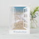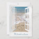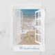 Vue sur la fenêtre ouverte sur les coeurs de plage dans le sable avec les noms et le surf d'océan mousseux pour le faire-part de mariage. Tout le texte est modifiable.
