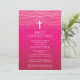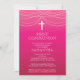 Belle invitation de la Première Sainte Communion avec une fine et délicate guirlande avec une croix blanche accrochée sur un arrière - plan à l'ombre chic et populaire unique fuchsia rose fushia. Retourner l'invitation pour trouver un fond d'ombre assorti pour une touche spéciale. Disponible dans notre boutique en différentes couleurs pour une fille ou un garçon.