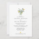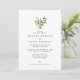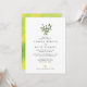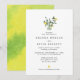 Invitation de mariage avec une simple et élégante composition de citrons aquarellés et de verdure dans un pot avec une police classique en dessous. Au dos de l'invitation, une éclaboussure aquarelle à fond perdu en jaune et vert.