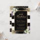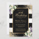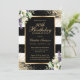 Elégante invitation à 30ème anniversaire rayée noir et blanc avec cadre doré décoré de confettis d'or, lys calla et verdure.
