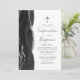 Le bord gauche de cette élégante invitation de confirmation moderne comporte une bordure en aquarelle noire ornée d'une parties scintillant en faux argent. Une fausse croix de feuille argent apparaît au-dessus du texte personnalisable, qui combine écriture manuscrite, cuivre et polices italiques en gris charbon sur un arrière - plan blanc. L'envers présente un design d'agate noir et argent assorti.