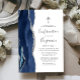 Le bord gauche de cette élégante invitation à la confirmation moderne comporte une bordure en aquarelle bleu marine ornée d'une parties scintillant en faux argent. Une fausse croix de feuille argent apparaît au-dessus du texte personnalisable, qui combine écriture manuscrite, cuivre et polices italiques en gris charbon sur un arrière - plan blanc. L'envers est assorti d'un design d'agate bleu marine et argent.