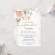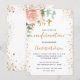 Un arrière - plan blanc décoré de verdure d'eucalyptus, d'or rose et de rose rose rousse, de feuilles dorés et de parties scintillant faux or en chute libre. Personnalisez et un nom et des détails de la cérémonie. Lettres noires et dorées. Retour : arrière - plan blanc avec gouttes de parties scintillant en faux or