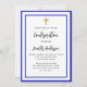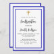 Une invitation moderne, élégante et de confirmation. Un arrière - plan blanc décoré de cadres bleus royaux et d'une croix dorée. Personnalisez et ajoutez un nom et des détails. Lettres de couleur noire.