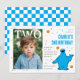 Celebrate turning two with this Cookie Monster–inspired birthday design featuring a bright blue checkerboard background and colorful confetti sprinkled throughout. The bold blue and white pattern creates a fun, energetic party vibe, while scattered sprinkles and tiny cookie accents add playful detail across the layout.