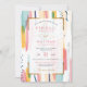 Cette invitation chic devrait être particulièrement adaptée à quiconque organise un mariage dans un style abstrait. Cette invitation peinte à la mode apparaît en bleu doux avec de belles rayures turquoises et roses et des taches sur un arrière - plan à motifs memphis. Cette invitation est ornée de coins de parties scintillant et revient à un lavage à l'aquarelle rose et jaune. Les détails de la fête sont présentés dans la typographie sans serif branchée. Ils sont parfaits pour ce couple moderne. customisez-les facilement pour les rendre parfaits pour vous. Merci de nous laisser faire partie de votre journée spéciale.