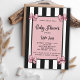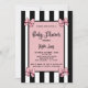 Invités Invitations pour fêter votre petit en style avec cette invitation chic Baby shower ! L'avant est orné d'un arrière - plan rayé noir et blanc audacieux, créant un look moderne et élégant. Au centre, les détails de l'invitation sont affichés dans un rectangle avec un arrière - plan rose doux, bordé d'un cadre noir épuré. Chaque coin du rectangle est orné de délicats arcs roses qui correspondent parfaitement au graphique principal, ajoutant une touche douce et féminine. Parfait pour un baby shower sophistiqué mais ludique, cette invitation allie élégance classique à une pop de couleur et de charme !