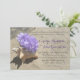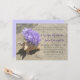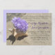 Jolie hydrangée violette remplit une coquille de conque de plage tropicale dans le sable, style photo invitation de mariage de plage avec texte personnalisé, accentué en violet.