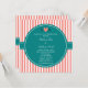 Coral rose et blanc rayures avec invitation à dîner de répétition turquoise. L'arrière - plan est décoré d'un motif alternant corail rose et rayures blanches. Le design présente également les initiales de la mariée et du marié séparées par un coeur rose. Un élégant motif rayé et au centre il y a un cercle turquoise où ajouter le texte de votre invitation.