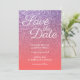 Photo fausse parties scintillant Amethyst et superposition à l'ombre de corail pour votre mariage enregistrer les informations de date. Le texte décoratif "Save the Date" est un joli style calligraphique contemporain en blanc. Coral ombre et rose pâle glam parties scintillant ombre mariage enregistrer la date. La photo a un flou bokeh des étincelles. Le nom et les informations d'événement sont dans un style de police plus classique. Les styles de police sont personnalisables.