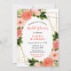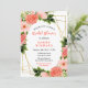 This fun and whimsical bridal shower invitation features watercolor coral pink red roses and foliage on a gold geometric frame. The text combines handwritten script and serif fonts for a stylish and modern look. This is perfect for a spring or summer rustic bridal shower.