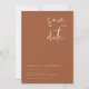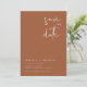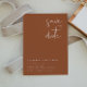 Cette date de sauvegarde comporte une police manuscrite pointue et un design minimaliste moderne. Modifiez facilement le libellé *most* pour répondre à vos besoins et modifiez toutes les couleurs à votre goût. Le ton bohème de la terre brûlée couleur orange en fait l'ajout parfait à votre boho, désert, ou mariage terreux.