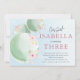 Adorable fête d'anniversaire invitation dispose de 3 aquarelles de ballon vert décoré de fleurs mignonnes en rose, jaune et bleu. Parfait pour les petites filles