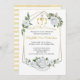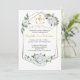Une belle invitation à la Première Sainte Communion avec un cadre géométrique couleur or agrémenté de sprays de roses blanches et de feuilles verts. Au sommet se trouve un chalice avec Eucharistie, croix et blé. Le dos est doté d'un motif rayé horizontal blanc et or.