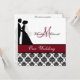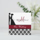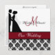 Impression damassée noire et blanche avec une bande rouge canneberge, une mariée et mariée en silhouette, et des zones que vous pouvez personnaliser avec vos noms, monogramme initial, cérémonie mariage et information de réception sur une faire-part de mariage customisée qui est classe et traditionnel tout en un! Faites défiler vers le bas pour obtenir les sceaux mariages correspondants.