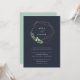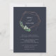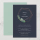 Notre faire-part de mariage Greenhouse vous propose des noms encerclés par une couronne géométrique moderne de fils de fausse feuille de cuivre, de feuillage botanique vert, de feuilles et de minuscules fleurs blanches. Personnalisez ce faire-part de mariage botanique moderne et élégant avec vos détails mariages sous le lettrage blanc chic sur un arrière - plan bleu marine frappant.
