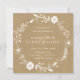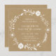 Cette invitation de mariage carrée présente une couronne florale botanique rustique blanche sur un fond de papier kraft faux brun.
