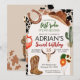 Lève-toi ! Prêt pour une fête d'anniversaire de rodéo cowboy ? Ce design présente des articles sur le thème du cowboy comme un casquette de cowboy, un fer à cheval, des cactus, un crâne et un motif d'impression de cow-boy ou de vache. Tout le texte est modifiable sur cet invitation d'anniversaire aux tons neutres ! Le design est neutre, adapté aux garçons et aux filles, et entièrement personnalisable pour un 1er ou 2ème anniversaire. Trouvez les articles correspondants dans ma boutique.