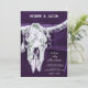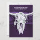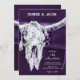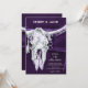 Ces modèles de carte d'invitation de mariage plates de 5x7 uniques et occidentaux rustiques que vous pouvez personnaliser présentent une conception de fond de texture de campagne blanche et violette foncée de crâne de vache de taureau de cow-girl de rodéo. Style de grange vintage vieux ouest sauvage inspiré antique cool, conception d'animal de ferme tendance. Rsvp en ligne au dos. Image copyright Marg Seregelyi Photography.
