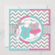 Une carte d'invitation à la fête, composée d'un chevron gris et blanc chic et d'un adorable sauteur à points d'aqua polka avec une cravate grise et un tutu rose chaud et sucré, est révélée par un genre sucré.