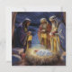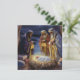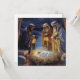 Partagez le véritable sens de Noël avec cette superbe carte de vacances plate mettant en vedette une illustration traditionnelle de la scène de la Nativité. Ce design artistique représente les trois Rois mages offrant des cadeaux au nouveau-né dans la crèche sous une brillante étoile de Bethléem dans une étable rustique paisible. Les couleurs profondes, le ciel nocturne étoilé et la lumière dramatique créent une image révérencieuse, évocatrice et intemporelle. Cette carte est un moyen élégant et significatif d'envoyer des vœux de Noël et des souhaits de paix et de joie pour la saison.