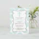 Cute invitation du Baptême avec une croix bleue sur un cadre chic et élégant sur un arrière - plan de pois vert pâle. Retournez notre invitation moderne au baptême pour trouver une pochette verte et blanche assortie. Idéal pour un baptême ou un baptême ou baptême de bébés filles contemporains. Disponible dans notre boutique en différentes couleurs pour un petit garçon ou une petite fille.