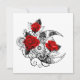 Contour, lune de croissant mécanique avec des engrenages, décoré de roses rouges avec des tiges noires spirées et feuilles sur arrière - plan blanc. Steampunk