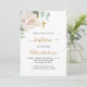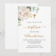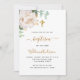 Un fond blanc décoré de verdure d'eucalyptus, d'une pivoine blanche et de feuilles dorées. Personnalisez avec le nom de l'enfant et les détails de la cérémonie. Lettres de couleur noire et dorée.