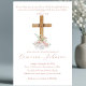 Cette élégante invitation au baptême florale personnalisée présente une image d'aquarelle religieuse au centre. Une croix de bois est agrémentée de fleurs blanches et blush, et d'une végétation délicate. Un exemple de verset biblique pour le baptême est imprimé au-dessus de la croix de bois.