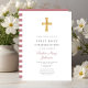 Custom Modern Pink Stripes Cross Girl First Communion Invitation.