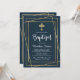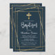 Élégant Script moderne Croix d'or Marine Bleu Boy Baptême Invitation avec (faux) cadre géométrique or.