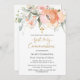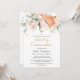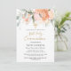 Invitation Florale Première Communion. Cette conception présente une aquarelle illustrant le rose rosâtre d'abricot et le feuillage verdoyant. Et en haut - effet doré Croix.