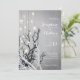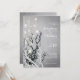 Chaîne de lumière cristalline verticale Faire-part de mariage gris à branche blanche. Moderne Elégant design hiver et automne avec des branches manzanita blanches et noires avec des cordes de cristal sur un arrière - plan gris grunge pierre. Customisez-le avec vos détails et supprimez ou ajoutez des textes.