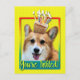 Invite your guests with this whimsical Corgi Dog Greeting Card. With a cupcake balanced on it's head, this design is sure to bring a smile and giggles! BTW, This design has several versions, with different background colours. There is also a Happy Birthday version.