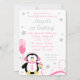 Une invitation à la fête d'anniversaire de l'hiver mignonne et girly onederland. Doté d'un pingouin, de cupcake, de tourbillons et de flocons de neige. Dans les tons rose et gris. Personnalisez facilement votre fête !