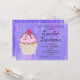 Un invitation de fête d'anniversaire avec l'illustration d'un cupcake à l'allure délicieuse. Le gel rose et les gouttelettes de chocolat. Porte-cupcake jaune et framboise sur le dessus. Yummy ! L'arrière - plan est une texture abstraite violette avec des petits coeurs partout.
