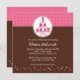 Cuisine et moderne invitation à la douche nuptiale. Comprend des cupcakes sur un stand avec des arroses au fond. motif Pois sur le bar supérieur. Couleur rose et marron avec accents crème et blanc.