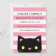 Super mignonne invitation fête d'anniversaire avec de larges rayures roses et blanches et un chat noir curieux.