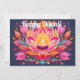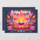 This Diwali card glistens with spiritual warmth and festive charm. A stunning lotus takes center stage, its layered petals painted in rich pinks, tangerine, and deep violet, each one radiating outward like ripples from a sacred flame. Nestled at its heart is a glowing diya, flickering gently with golden light. The backdrop is a twilight canvas of midnight blue, speckled with delicate dots and flourishes, adding a celestial touch.